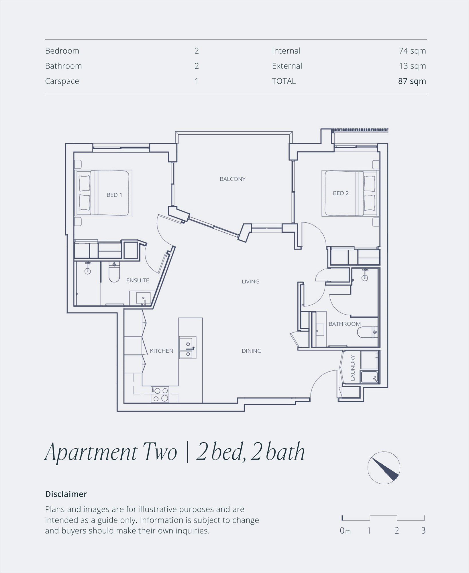 The master bedroom features a private ensuite, while the second bedroom is conveniently located near the main bathroom, ensuring comfort and privacy for all.